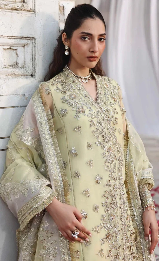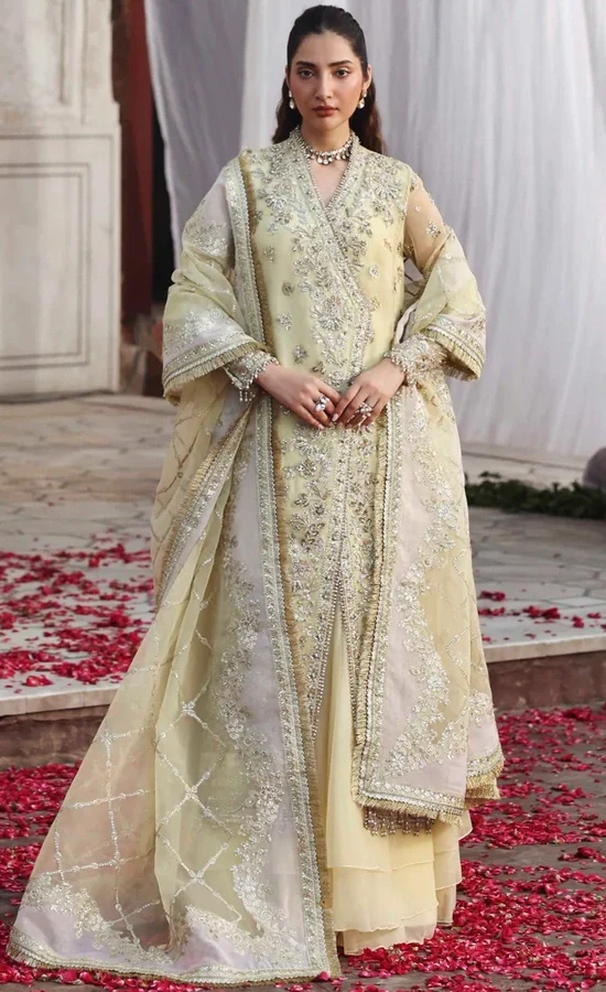 The Angrakha Style Frock combines traditional and modern styles. It has a soft chiffon top that flows nicely and a twisted silk bottom that drapes well. Together, they create a graceful shape that shows poise and charm. Intricate hand embroidery, eye-catching chatta patti accents, and delicate tassel detailing elevate this piece into a masterclass of artisanal craftsmanship. The chiffon dupatta is perfect for Pakistani weddings and large celebrations. Its simple elegance adds sophistication and a touch of drama to your outfit. This versatile piece will make a lasting impression and showcase a true sense of royal style and craftsmanship.