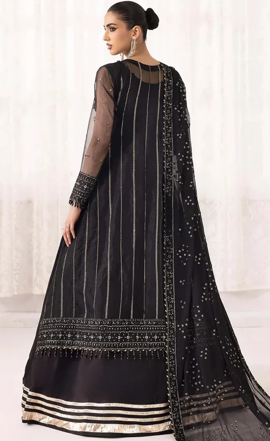 This black sharara suit combines traditional style with modern elegance, making it an excellent choice for Pakistani weddings. Made from soft chiffon, this ready-made three-piece outfit features detailed hand embroidery on the front, back, and sleeves. It has delicate borders that enhance its sophisticated look. The embroidered neckline and borders add to its regal feel. The sharara has flowing Dhaka kalis with more intricate embroidery and a simple hemline that offers graceful design. The outfit includes a chiffon dupatta with embroidered borders all around. Modern touches like chatta patti, patchwork, and tassels add a contemporary flair to this classic silhouette. This beautiful black sharara set ensures you stand out with style and grace at any wedding celebration.
