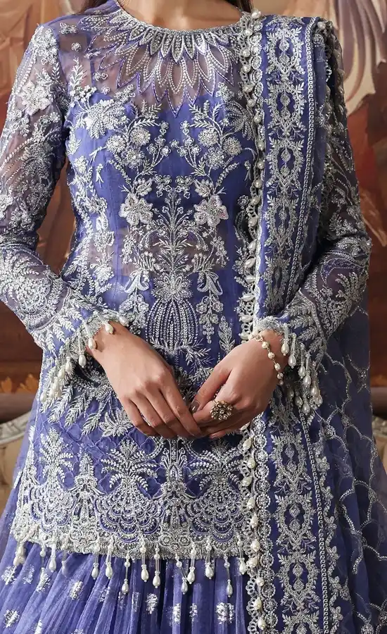 The chiffon dupatta has detailed embroidery and a four-sided border, making it a great finishing touch. The Blue Colour Anarkali Dress combines modern touches like tassel lace and patchwork with traditional design. It is perfect for a grand Pakistani wedding or a festive event, helping you stand out with its classic beauty. This dress is not just clothing; it is a work of art that honors rich traditions and makes a lasting impression.
